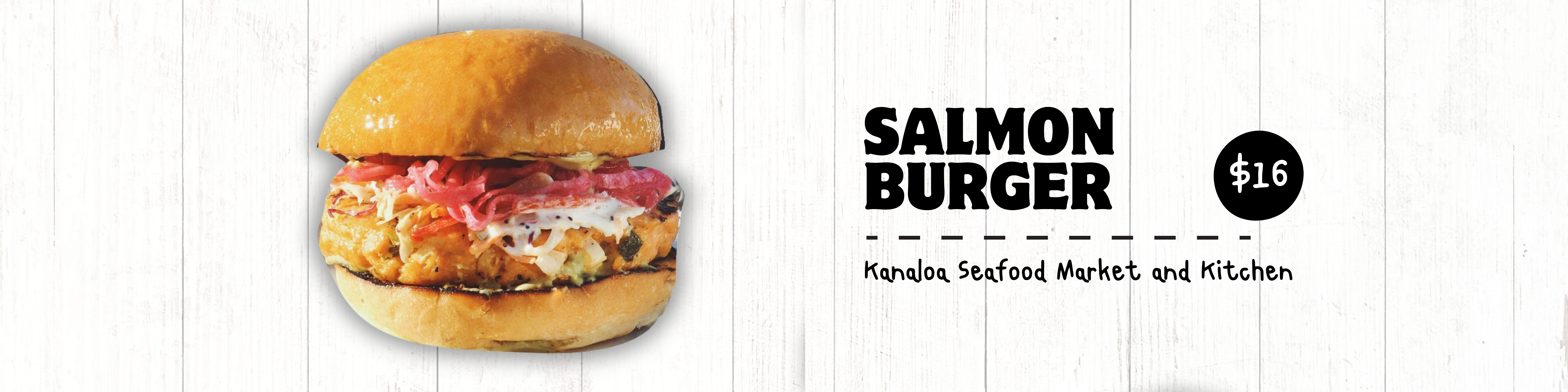 Reel in your hunger with Kanaloa's Salmon Burger! A juicy salmon patty with zesty chimichurri aioli, crunchy slaw, tangy pickled red onions, all on a brioche bun that's no fish story. Chips or fries? That's your fish to fry!