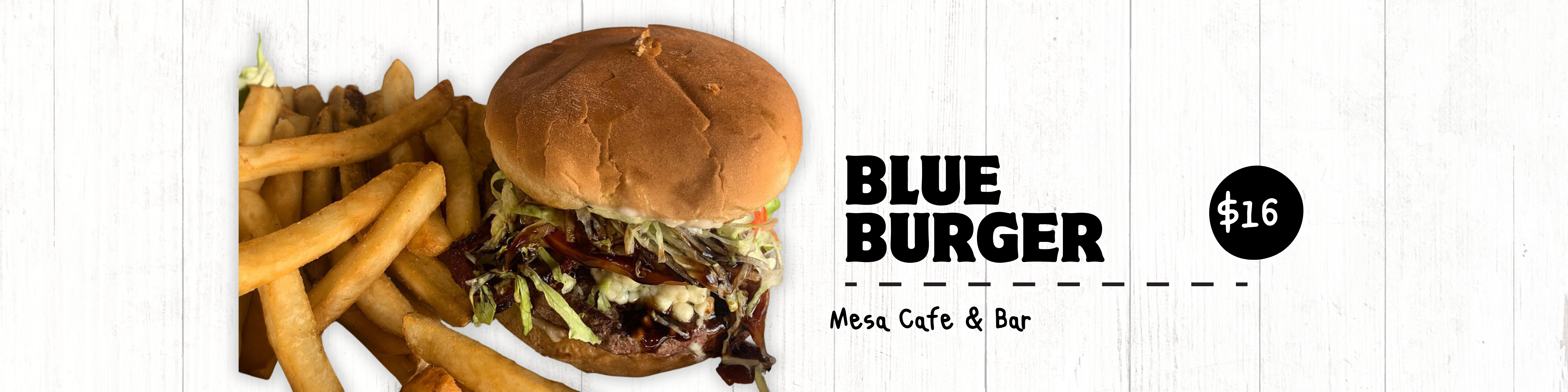 Blue mood, better food! Mesa Cafe & Bar's Blue Burger: where bleu cheese dreams meet crispy bacon streams. Top it off with a balsamic gleam, and you've got a masterpiece with fries on the side.