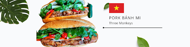 Pork Bahn Mi: Experience the timeless flavors of Vietnam with Three Monkeys' classic Bahn Mi, featuring succulent grilled pork, pickled vegetables, fresh herbs, and creamy pâté, all nestled within a crusty baguette.
