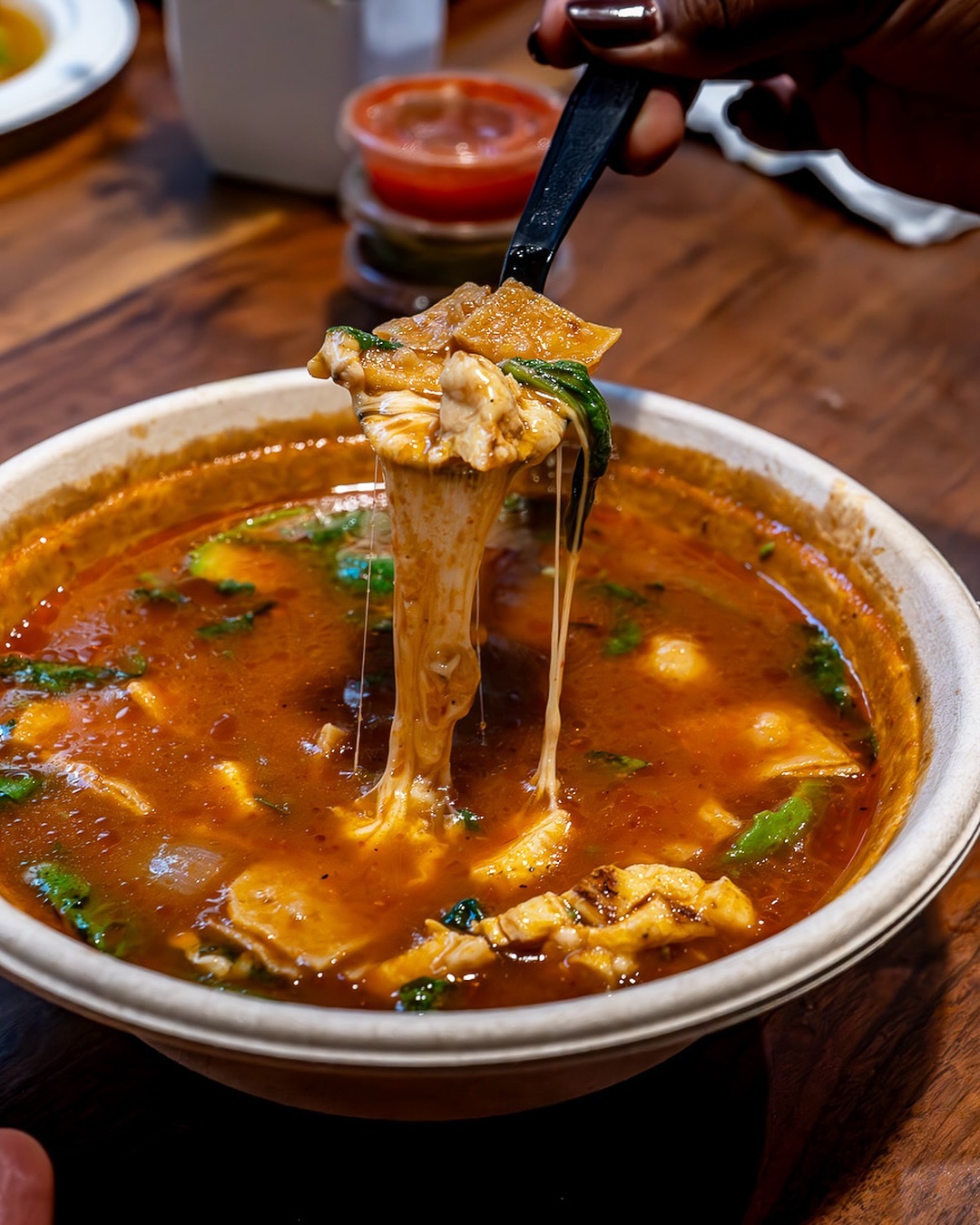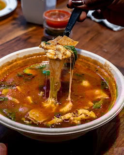 (pasilla chile broth, grilled chicken, avocado, oaxaca cheese, and braised local greens)