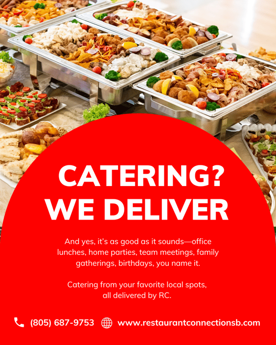 Restaurant Connection delivers catering from Santa Barbara’s top local restaurants—straight to your home, office, or venue.