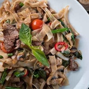 Fat flat rice noodles, green beans, white button mushrooms, cherry tomatoes, sliced white onions, red jalapeno, Thai Chilis, fresh garlic, mushroom soy sauce, oyster sauce, Thai basil.