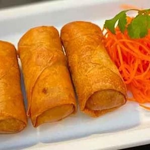 Crispy egg rolls, cellophane noodles, green cabbage, carrots, Chinese shiitake mushrooms, fresh garlic, soy sauce, white pepper, housemade plum sauce.
