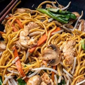 Round firm wheat noodles, bunashimeji mushrooms, Chinese shiitake, white button mushrooms, fresh garlic, mushroom soy sauce, oyster sauce, Chinese broccoli, carrots, bean sprouts.