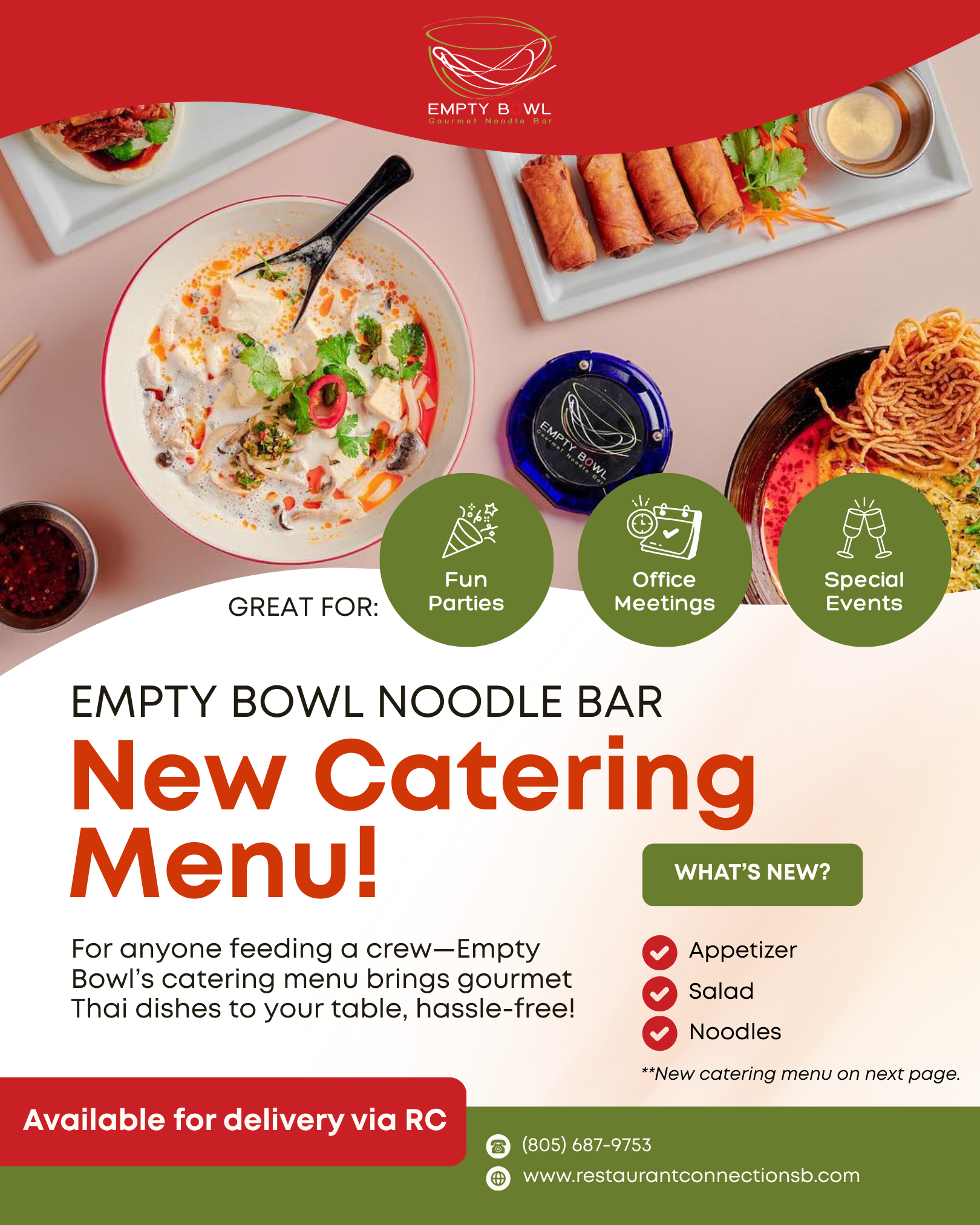 Empty Bowl’s new catering menu is officially live—and it’s got everything: ✅ Thai noodles ✅ Papaya Salad ✅ crowd-pleasing small bites