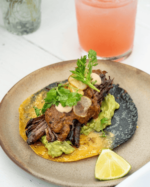 Alma Fonda Fina - It’s just one taco, but oh, it’s everything. Tender wagyu beef, creamy guac, crispy potato, and smoky chorizo mayo—all layered on a handmade blue corn tortilla. It’s bold, comforting, and wildly flavorful.