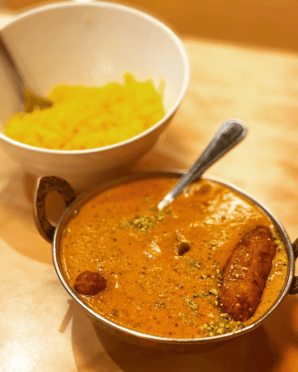 Apna Indian Kitchen - Soft, spiced veggie koftas simmered in a golden sauce of fresh tomatoes, onion, ginger, garlic, and saffron. It’s cozy, rich, and totally gluten-free—served with fragrant basmati rice that soaks up every last drop.