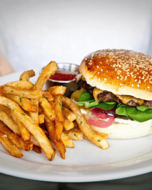 Jane’s Restaurant - This burger doesn’t mess around. Juicy beef patty stacked with creamy gouda, caramelized onions, and garlicky aioli—all hugged by a homemade sesame bun. Add crisp fries or a green salad to make it a full-on feel-good meal.